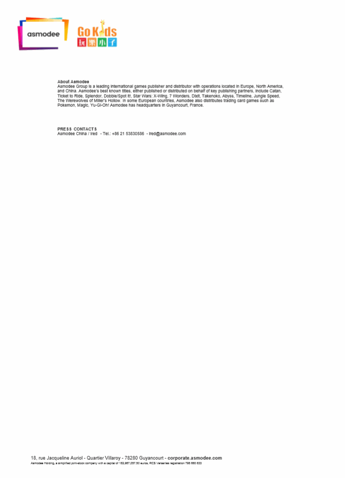 “我们很高兴并欢迎GoKids玩乐小子加入Asmodee集团,”Asmodee集团总裁Stephane Carville这样说道。“凭借其出色的游戏类别分布和经验丰富的本地分销经验,相信我们在亚洲桌面游戏市场的影响力将会变得更强。”