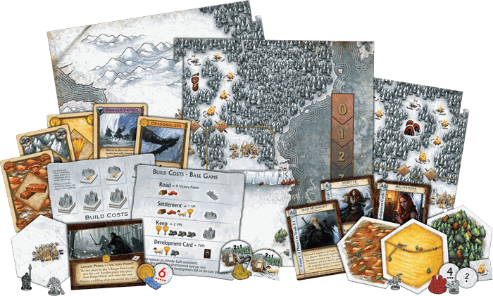 《A Game of Thrones Catan: Brotherhood of the Watch》将权力的游戏中的经典场景和人物带入到大家熟悉的卡坦岛游戏之中,游戏在经典的赠地展开,提供五种资源之一:木材、砖、羊毛、粮食和矿石。目前贫瘠的冰原上寸草不生,玩家们将扮演长城守卫的一员,使用这些资源来加强北方的建设并努力定居下来。游戏中可以进行诸多针对AGOT特有的行动来发展自己的经济,以此获得胜利点来提高玩家的力量和认可度,相信这些玩法对于卡坦岛的老玩家都是再熟悉不过的设定。一旦有任何一名玩家获得了10分游戏结束,这名玩家获得胜利并成为长城守卫的新守夜人司令。